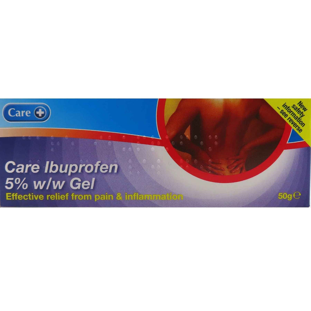 Care Ibuprofen Gel 5% is a topical rub for the relief of pain and inflammation associated with backache, rheumatic and muscular pain, sprains, strains, and sports injuries.