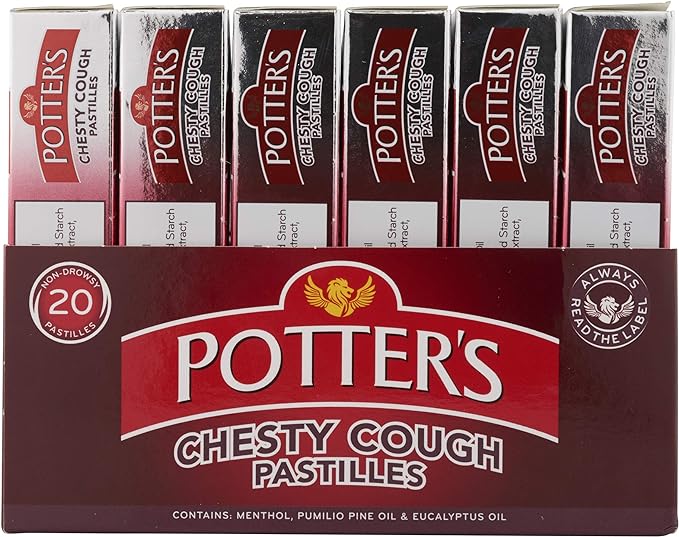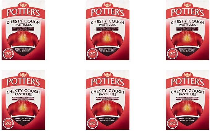 Potters Chesty Cough Pastilles effectively relieve the symptoms of catarrh, coughs and colds. These pastilles have expectorant properties which help to decongest and unblock the respiratory system helping to soothe a chesty cough with a warming feeling. Suitable for Adults, the Elderly and Children over 12 years. Read the enclosed leaflet before taking this medicine. Ask your doctor or pharmacist if you need more information or advice. Do not take more than 20 pastilles in 24 hours. Do not exceed the stated dose. Not recommended for children under 12 years. You must contact your doctor if your symptoms worsen or do not improve.