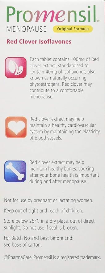 Promensil Menopause Tablets are daily dietary supplements formulated specifically for women during and after the menopause, as they can help to support and maintain general health and well-being in women; they are made using red clover isoflavones which has been shown to help maintain healthy bones and cholesterol levels to keep you fit and healthy at all times.