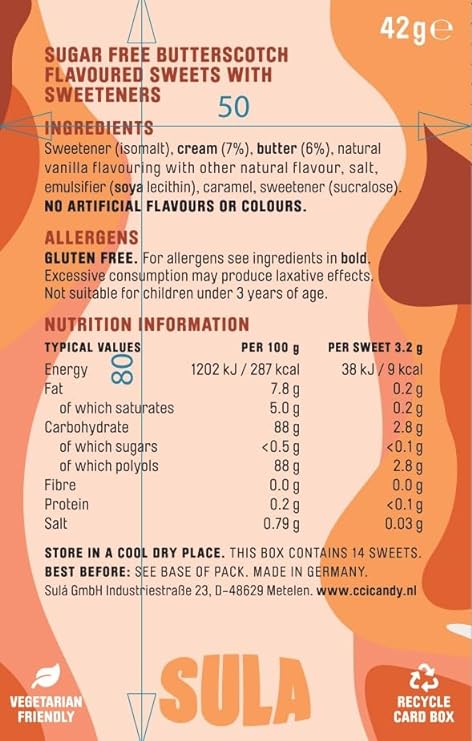 Isomalt, Butter, Vegetable Fat, Salt, Whole Milk Powder, Caramel, Soya Lecithin, Natural Flavours, Sucralose.