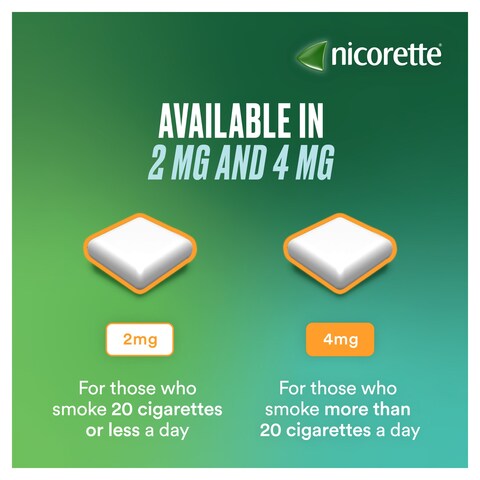 Nicorette 2 mg Gum is suitable for those smoking 20 cigarettes or fewer a day. For adults and children 12 years and over. Please read the package leaflet carefully before starting to use the product and note the chewing technique. Chew one piece of gum when you feel the urge to smoke. Do not use more than 15 pieces a day. Chewing Technique: 1. Chew slowly until the taste becomes strong. 2. Rest between gum and cheek. 3. Chew again when taste has faded. Nicorette gum relieves and/or prevents withdrawal symptoms including cravings experienced when trying to stop smoking or cutting down on cigarettes. It provides a safer alternative to smoking for both the individual and those around them. Ideally you should aim to stop smoking. However, this product can be used either to completely replace all your cigarettes, or if you do not feel ready to stop smoking completely, to replace certain cigarettes and therefore help you to cut down. It may also help increase your motivation to quit. Always read the label. Requires willpower.
