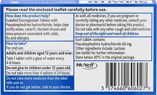 Each tablet of Sudafed Decongestant Tablets contain the same amount of ingredients. All of the Sudafed Decongestant Tablets Ingredients can be found on the back of the packet and patient information leaflet online.