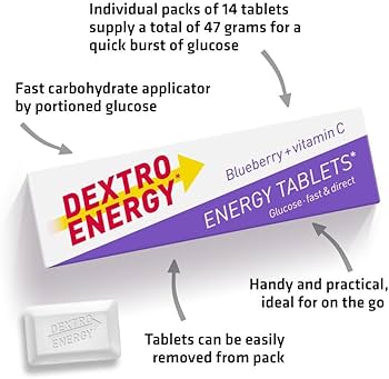 Dextrose tablets are an efficient source of energy. Dextro Energy is ideal for launching into action. It is available in eight fruity flavors and has a fresh and tasty Blueberry flavor, providing nutritious glucose. Additionally, it includes vitamin C, which supports the body's natural defenses. Convenient and practical, these energy tablets are perfect for those on the go. For diabetics, it is recommended to carry glucose in their pocket or purse in case of hypoglycemia. Each individual pack includes 14 tablets, supplying a total of 47g for a quick energy boost.