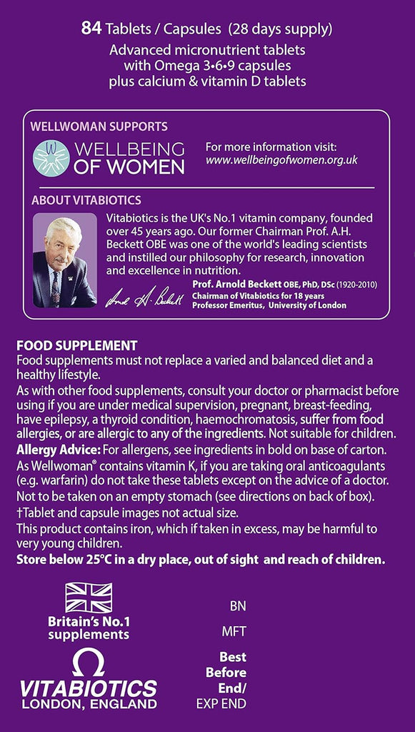TAKE WITH YOUR MAIN MEAL: ONE MICRONUTRIENT TABLET (PURPLE BLISTER), PLUS ONE OMEGA 3-6-9 CAPSULE (GREEN BLISTER), PLUS ONE CALCIUM TABLET (BLUE BLISTER). Swallow each with water or a cold drink. Not to be chewed. Do not exceed the recommended intake. To be taken on a full stomach. This comprehensive formula replaces other Wellwoman multivitamins. There is no need to take an additional multivitamin.